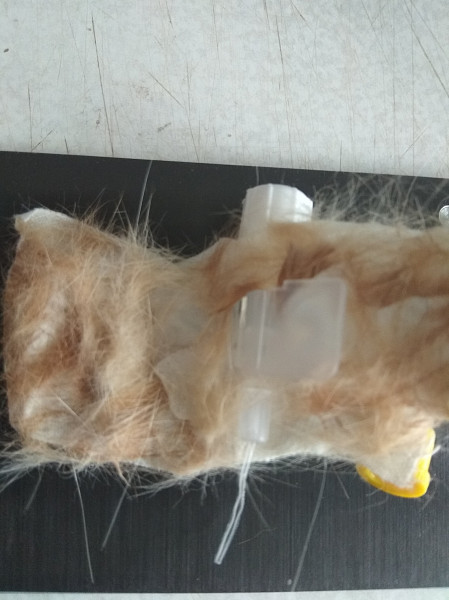 Таким образом, после установки катетера металлическая игла в нем уже отсутствует, а в вене остается тонкая пластиковая трубочка, которая плавно повторяет изгибы вены не травмируя ее. Это позволяет безопасно оставлять катетер в вене на срок до 4-5-и дней и даже дольше, если не возникает осложнений. Чтобы избежать смещения, катетер фиксируется к лапе лейкопластырем. А для защиты от внешних факторов еще и забинтовывается дополнительно снаружи.