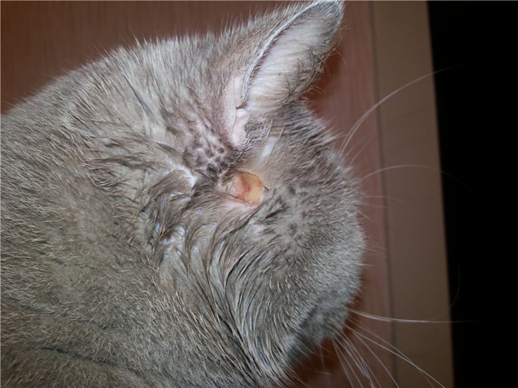 | Клещ распространяется на естественные залысины возле ушка и мордочку, из-за чего она опухает | |