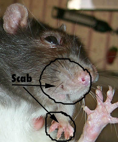 Эти мелкие насекомые красного цвета, размером не более 0,5 мм, питаются кровью зверька, для чего делают в коже микропроколы, вводя вещество, препятствующее свёртыванию. Именно оно может стать причиной аллергического чиханья у животного. Кроме того, крыса становится беспокойной, постоянно чешется и нервничает.