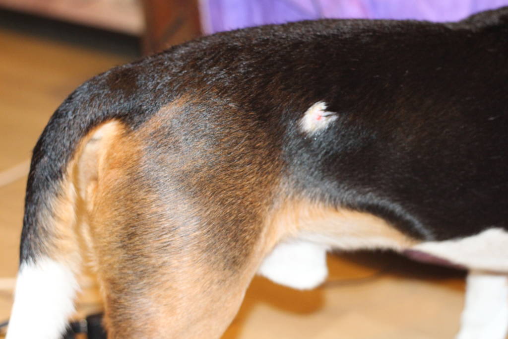 Что касается Блю, мы думаем, что он порезал или поранил кожу, когда переползал через забор (что он был склонен делать), когда мы возвращались домой.