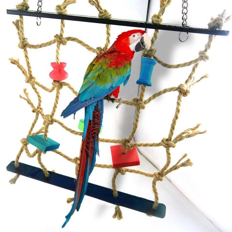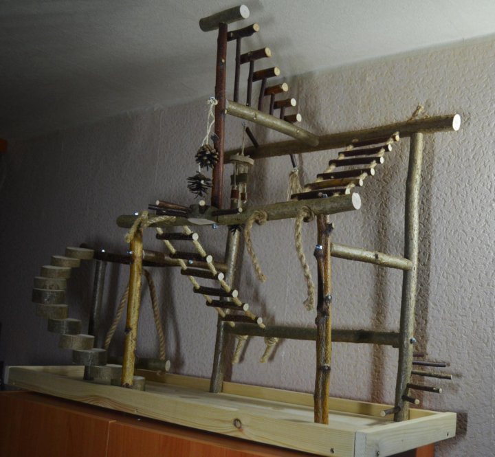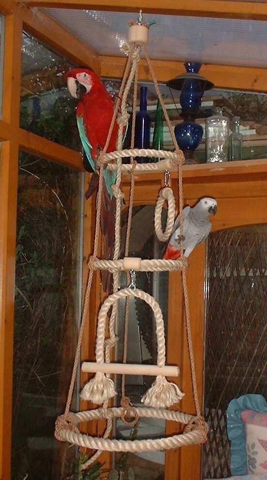 Эти замечательные пернатые обожают постоянно карабкаться и раскачиваться, потому они оценят лесенки, качельки, кольца и канатики на стенде. Лесенки могут быть как деревянными, так и веревочными.