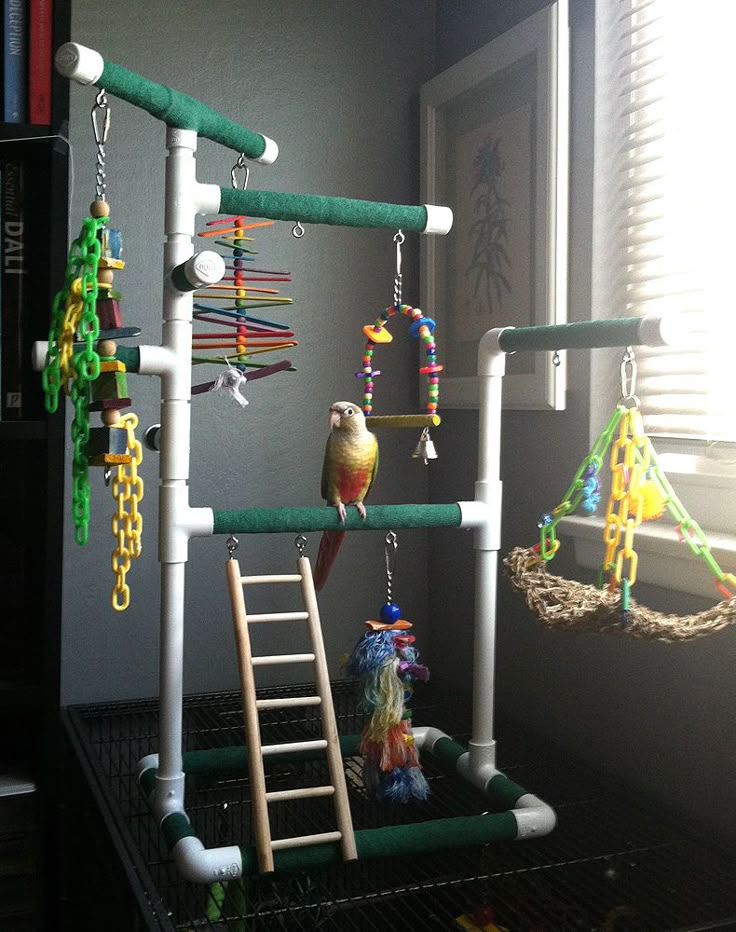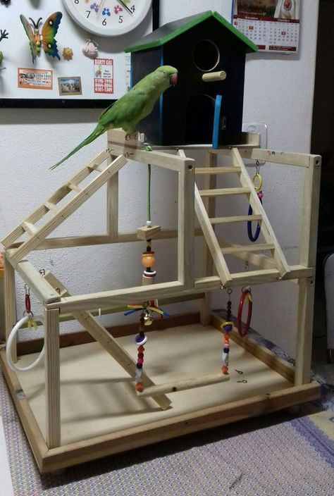 При обустройстве игровой площадки своими руками следует исходить из породы своего питомца. Мелкие породы более суетливые, потому любят все время на чем-то кататься, крутиться, лазить. Средние и крупные попугаи, такие как кореллы, жако, ара и какаду, действуют более спокойно. Они любят перепархивать с места на место, висеть вниз головой, ходить по мостикам.