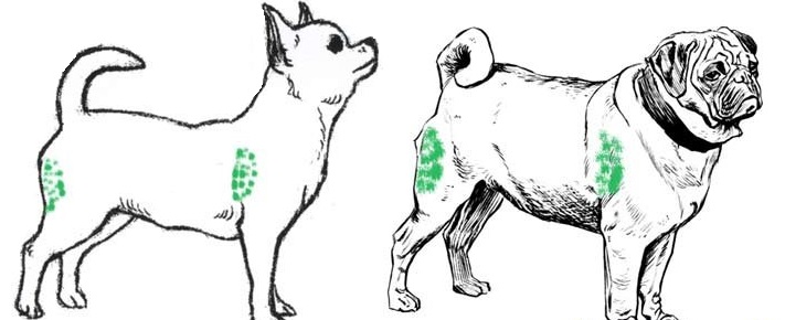 Чтобы уменьшить болевые ощущения от укола, следует расслабить мышцу. Для этого можно немного согнуть собаке лапу и помассировать область введения. Иглу нужно вводить под углом 45° на глубину до 1,5 см мелким породам и до 3 см крупным породам.