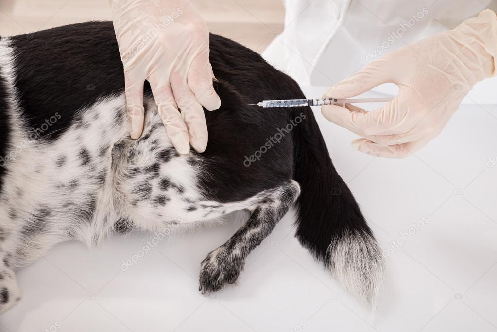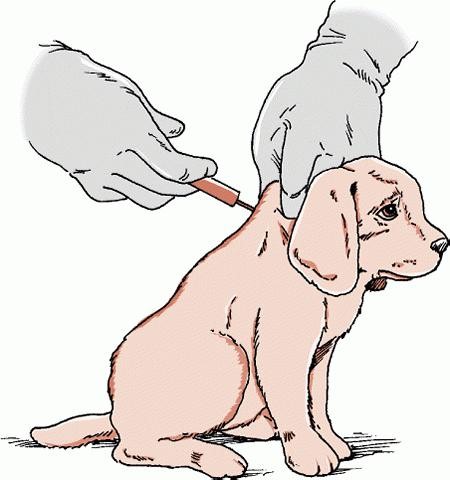 Иглу вводят чуть дальше, чем наполовину, под углом в 90º. При этом необходимо учитывать размеры собаки. Если ее вес не превышает 10 кг, то потребуется глубина 1-1,5 см. Для крупных собак этот параметр составляет 3-3,5 см.