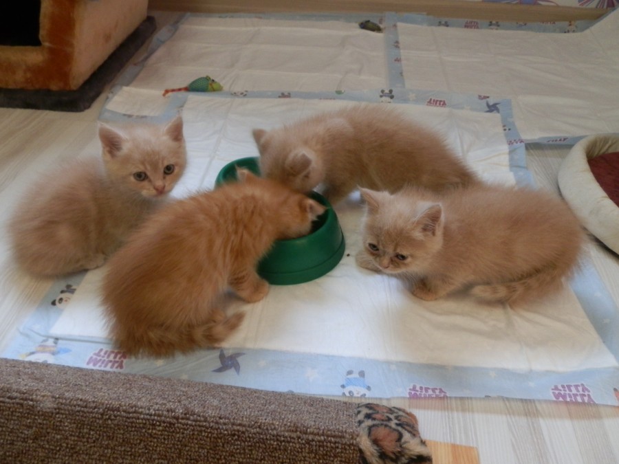Заводчики прикармливают детенышей 2-3 раза в день, унося их от матери в другое помещение. Корм распределяют по мисочкам и каждого котенка слегка окунают мордочкой в еду.