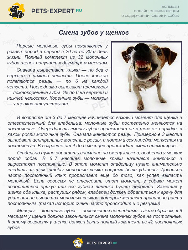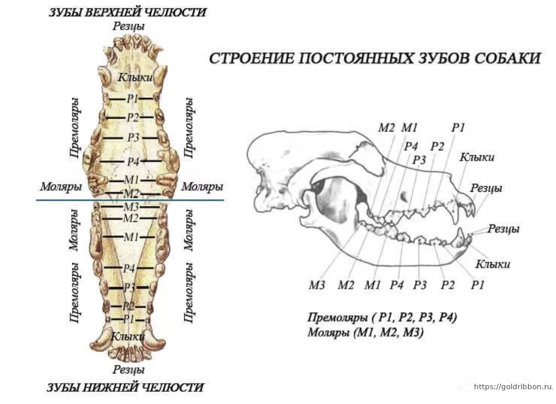 Строгого расписания смены зубов конечно же нет, есть примерные сроки, в которые укладываются все процессы смены временных зубов на постоянные. Сначала происходит смена резцов — в 3-4 месячном возрасте, клыки меняются между 4-6 месяцами, а премоляры начинают меняться между 5-6 месяцами. Моляры же вырастают к концу 6 месячного возраста животного.