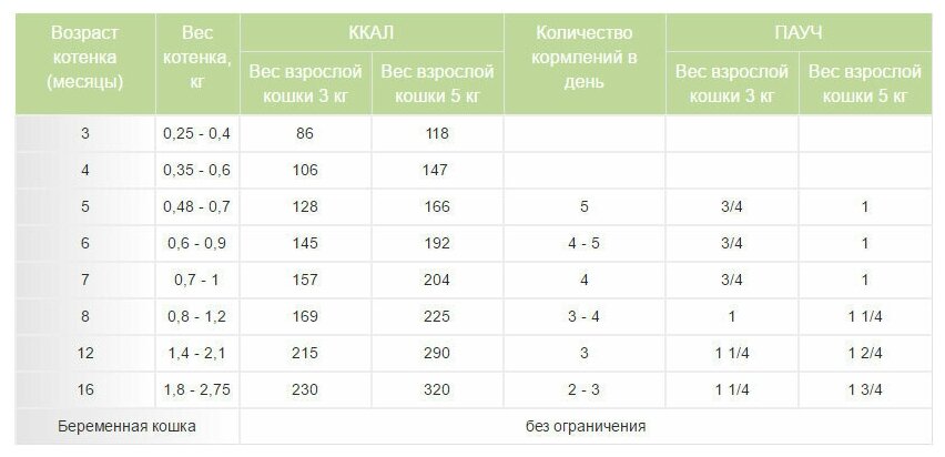 Не стоит давать котятам в этом возрасте натуральную свинину, копчености, жирные кисломолочные продукты, куриное мясо с костями и речную рыбу. - Вес до конца четвертого месяца после рождения. По стандартам котята в этом возрасте весят 1,7-2,4 кг (самки), а самцы 2,1-3,9 кг. Сейчас котенок уже больше похож на взрослое животное. В зависимости от рациона и наследственности котенок может набрать 2 кг. К котенку весом больше 4 кг нужно присмотреться: возможно, количество пищи можно сократить.