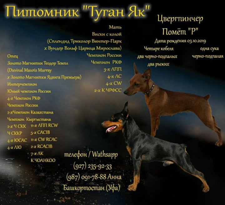 Цвергпинчера, равно, как и собак любых других мелких пород, можно вязать: кобелей с 12 месяцев; сук с 15 месяцев, но, желательно, не ранее второй течки.
