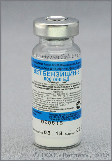 Ветбензицин-3 — лекарственное антибактериальное средство для лечения животных при болезнях бактериальной этиологии, пролонгированного действия в форме порошка для приготовления суспензии для внутримышечного введения 600000 ЕД.