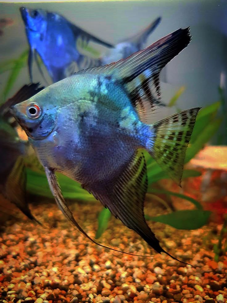 Рыбки, окрашенные в голубой насыщенный оттенок, получили название –«Голубой ангел». Наиболее высоко ценятся особи, у которых отсутствуют темные полосы. Полупрозрачные плавники также окрашены в голубой цвет.