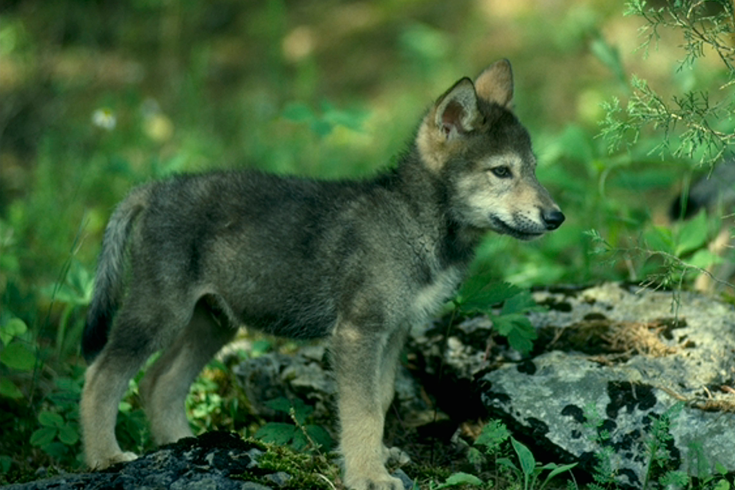 Волчицы-матери не покидают логово в течение первых нескольких недель, полагаясь на отцов, которые обеспечивают их и их детенышей пищей. Щенки начинают есть твердую пищу в возрасте трех-четырех недель. У них быстрый темп роста в течение первых четырех месяцев жизни: за этот период вес детеныша может увеличиться почти в 30 раз. Щенки волка начинают драться в возрасте трех недель, хотя, в отличие от молодых койотов и лисиц, их укусы мягкие и контролируемые. Настоящие драки за установление иерархии обычно происходят в возрасте пяти-восьми недель. В отличие от молодых койотов и лисиц, которые могут начать драться еще до начала игрового поведения. К осени щенки становятся достаточно взрослыми, чтобы сопровождать взрослых на охоте за крупной добычей.