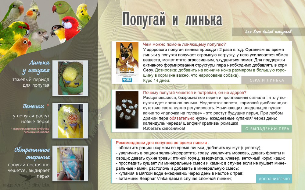 «Совет. Любимец быстрее справиться со сменой оперения и перестанет чесаться, если обогатить его рацион витаминами. Веточки деревьев также позволят птахе почувствовать себя лучше и почесаться при необходимости».