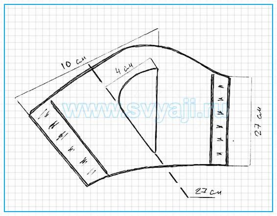 Переходим к нижней части. Из первого ряда по линии талии провязываем 20 сантиметров по первой схеме. Затем отложите 11 мот. в середине под отверстие для надевания. Левую и правую сторону вяжем по отдельности 7 сантиметров. Одновременно с этим выполняем убавление, 2 столб. с каждой стороны. Сшиваем части полотна, не забывая оставить отверстие для надевания и проймы для лап.