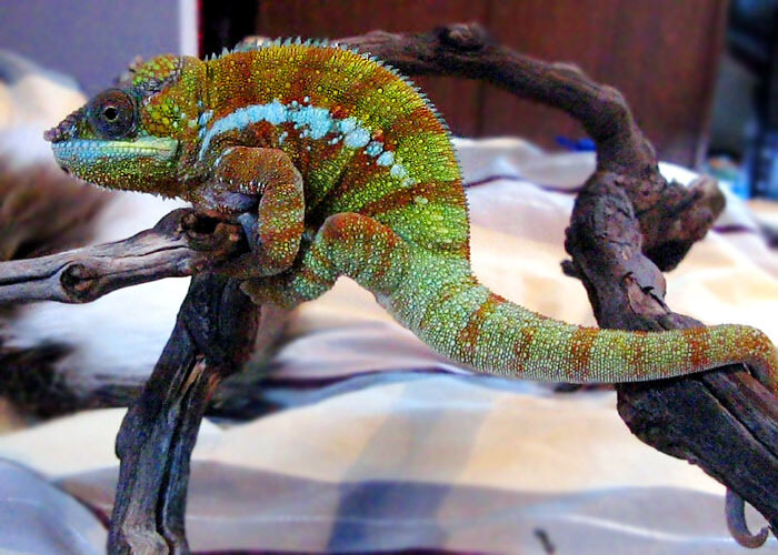 Если хамелеон содержится в качестве домашнего питомца, то в обычной обстановке он зелёный, и без причины у него нет необходимости изменять цвет.