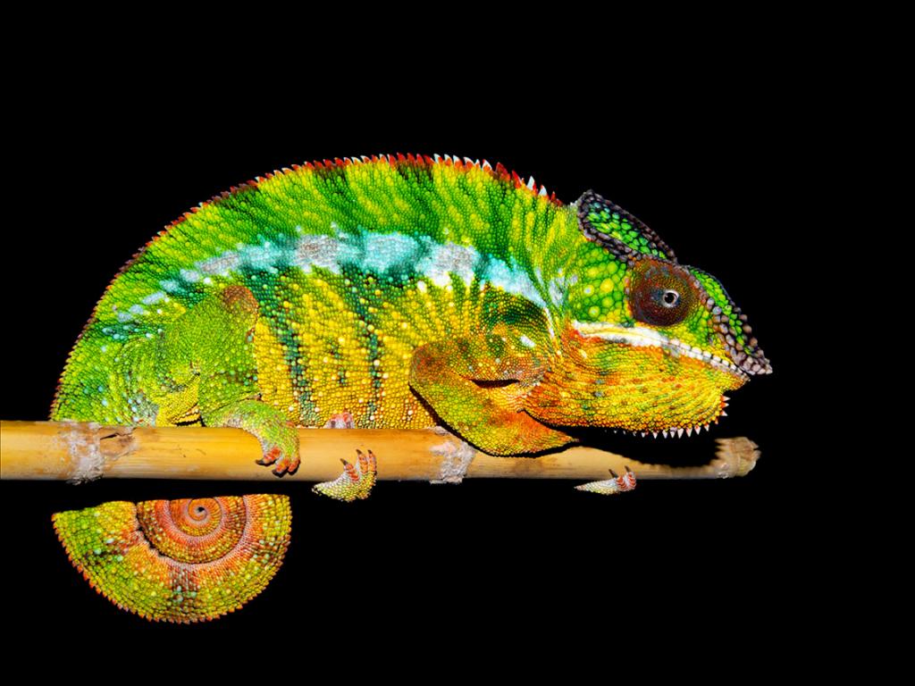 Оказывается, для смены окраски хамелеоны используют фотонные нанокристаллы, дающие возможность «управлять» светом с предельной точностью. Это подтвердилось в ходе экспериментов с самцами мадагаскарского пантерного хамелеона, которые во время общения с другими особями могут менять свою окраску от сине-зеленой до ярко-красной за очень короткое время.
