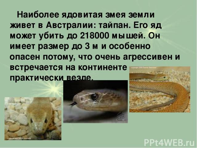 найден в Австралии. Самый токсичный яд видов в США принадлежит восточной гремучей змее с ромбовидной спиной.