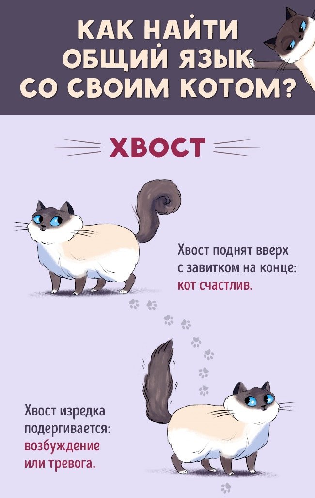 Помимо этого, важная роль в словаре-переводчике кошачьего языка отводится хвосту. Эта часть тела не только помогает удерживать животному баланс, но и сообщает о текущем настрое создания.