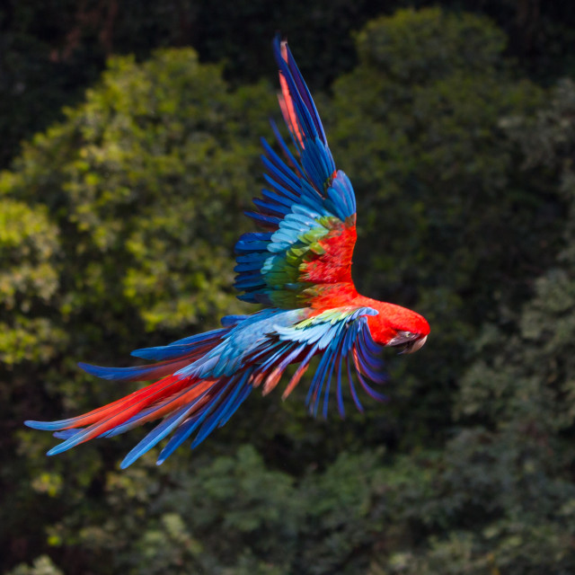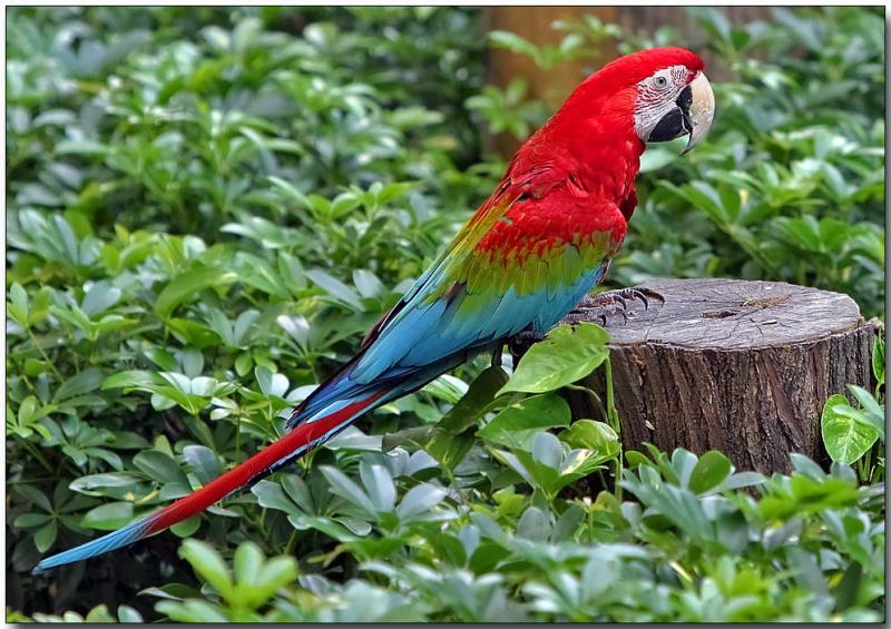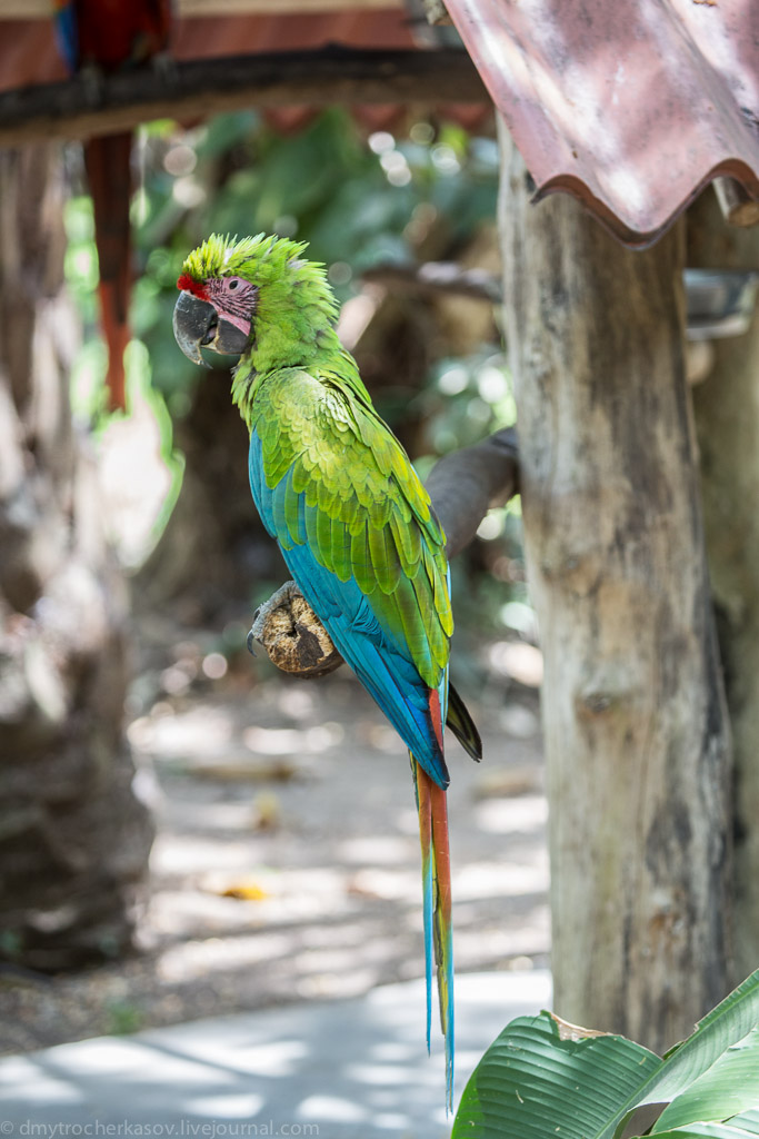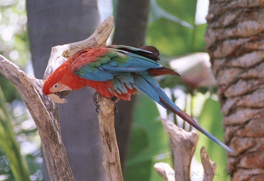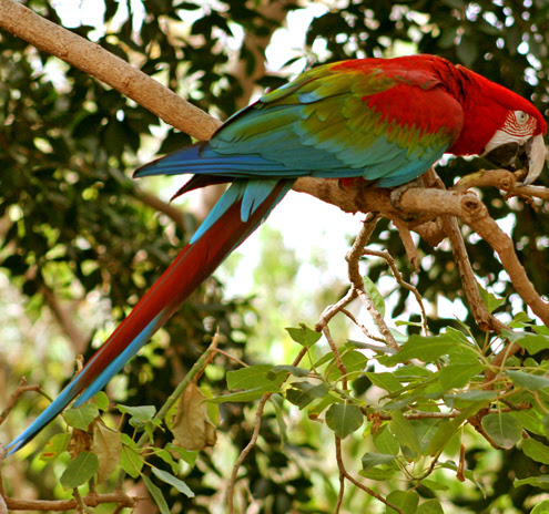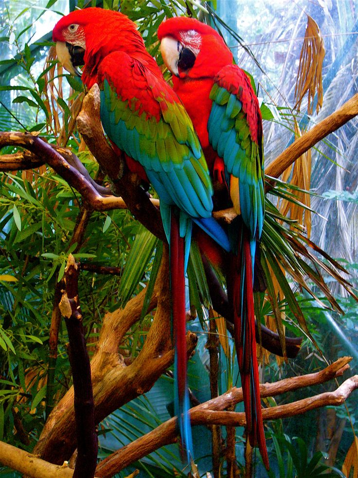 Ара макао. Длина до 85 см. Места обитания: от юга Мексики до Мату-Гросу через северную часть Южной Америки восточнее Анд. Один из самых роскошных видов ара. Лоб, темя, горло, спина, грудь и живот ярко-красные. Крылья, главное оперение, подхвостье и крестец светло-голубые. Хвостовые перья ярко-красные с голубыми полями.