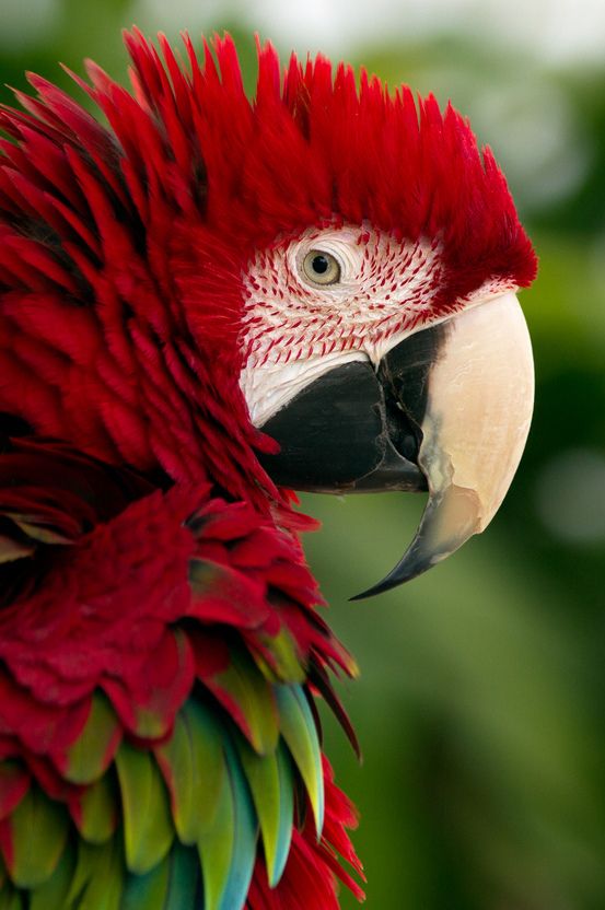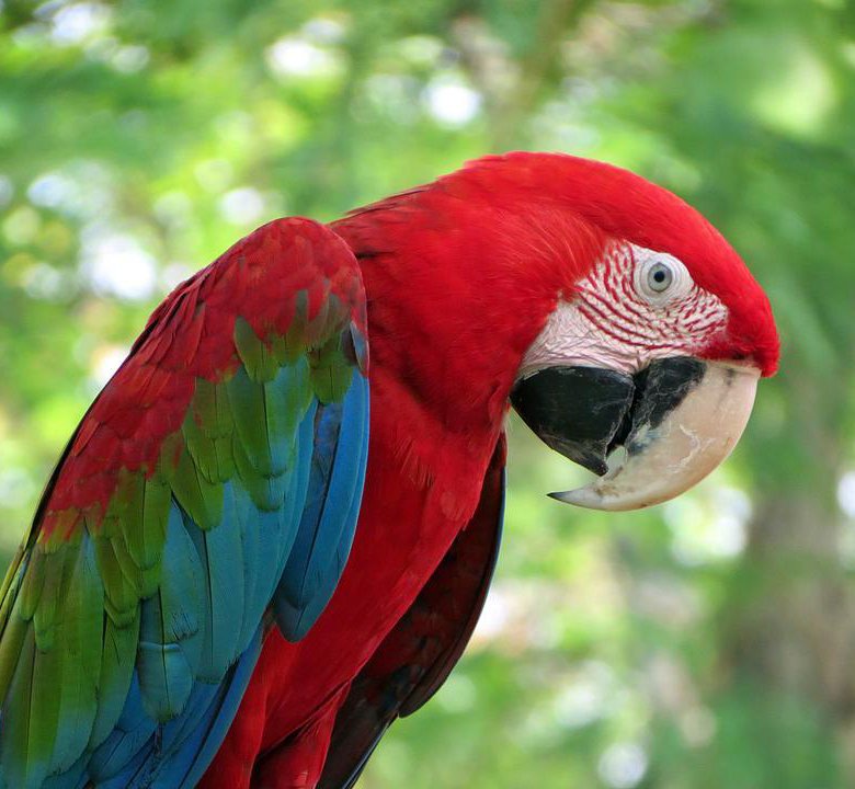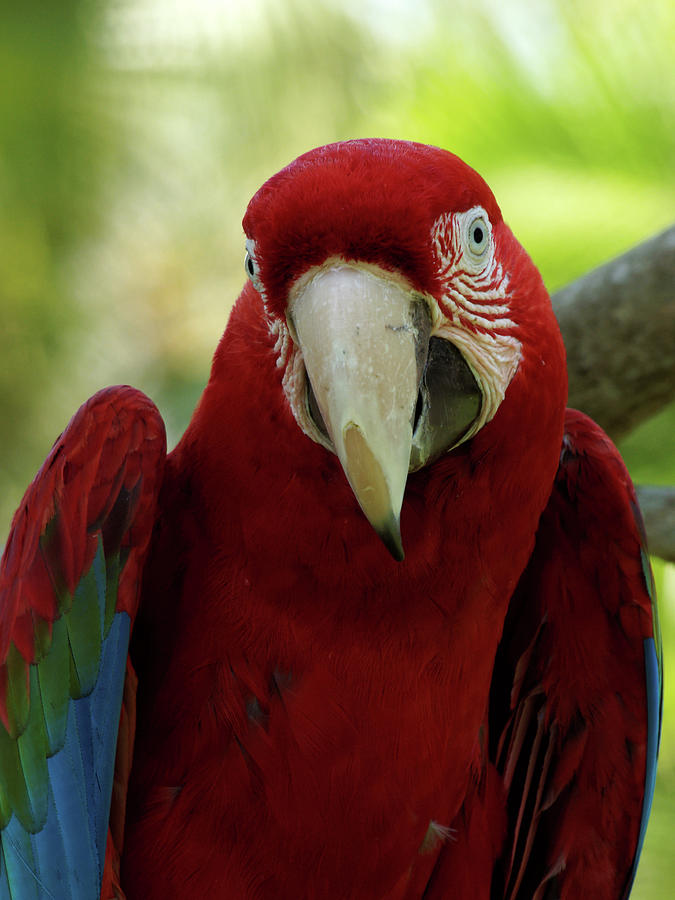 - Лицо: Зеленокрылый ара имеет красные полосы перьев вокруг глаз на голом белом участке кожи, которого нет у Скарлет.