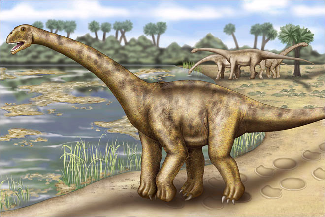 Апатозавр ранее под названием Brontosaurus («обманчивая ящерица»; найден на западе США): размер динозавра составлял от 70 до 90 футов, но его голова была всего около 2 футов в длину