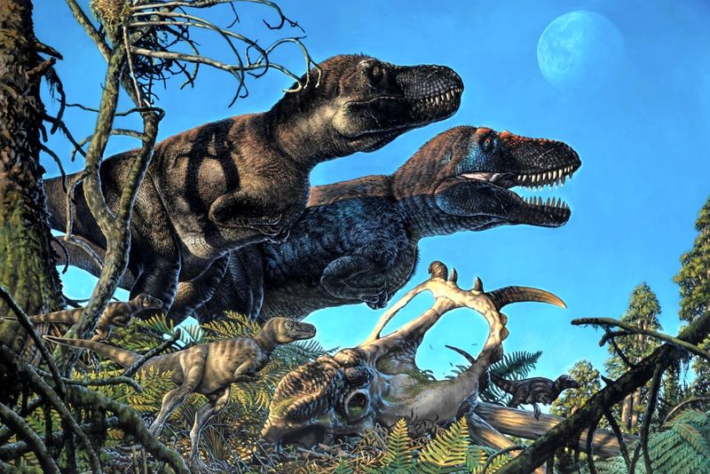 Tyrannosaurus rex («ящерица-тиран»; встречается в Северной Америке и Азии): T. rex, король динозавров, доминировал в этот период.