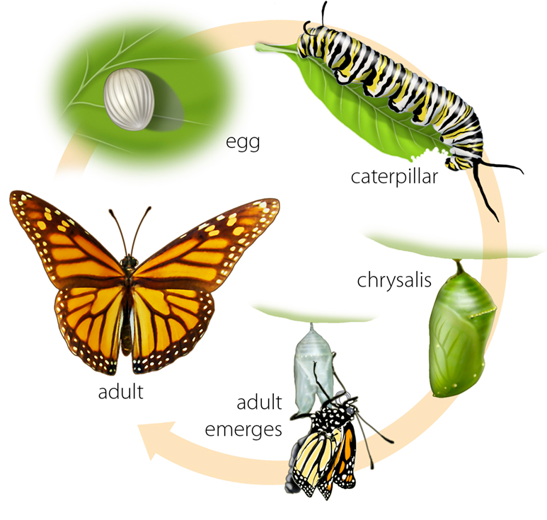 У всех бабочек происходит «полная метаморфоза». Чтобы превратиться во взрослую особь, они проходят 4 стадии: яйцо, гусеница (личинка), куколка (куколка) и взрослая особь. В зависимости от вида бабочки жизненный цикл бабочки может занимать от одного месяца до целого года.
