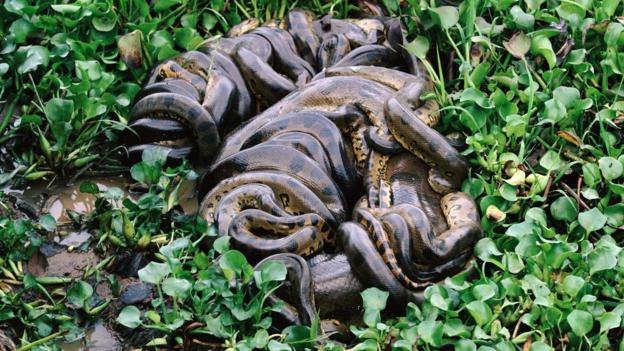 Обычно самка гигантской анаконды тихо лежит в грязи или на мелководье, а самцы пытаются ее обнаружить.