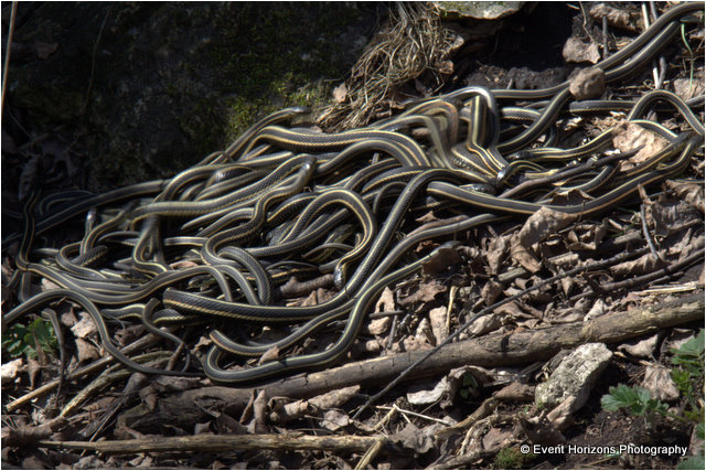 Чтобы выжить в суровые зимы, неядовитые краснобокие подвязочные змеи, а также некоторые западные равнинные подвязочные змеи, используют трещины в нижележащей известняковой породе, чтобы получить доступ к пещерам ниже линии замерзания и выше уровня грунтовых вод. Когда весеннее солнце начинает согревать скалы, они медленно всплывают.Самцы выходят первыми и собираются у входа, чтобы получить возможность спариться. По мере того как самки появляются по несколько, вялые, но возбужденные самцы преследуют их и образуют брачные шары, которые на самом деле не имеют формы шара и могут включать от двух до 100 змей.