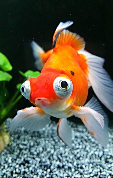 Порода с яйцевидным телом, не отличающаяся большой активностью. Обычно вырастает до 10 см, нередко встречаются особи до 18 см в длину. Среди других видов золотых рыб пузыреглаз выделяется, помимо необычных органов зрения, формой хвоста – он не свисает вниз. Спинного плавника нет вовсе. Узнать пузыреглаза в аквариуме просто: его яркая, заметная особенность – большие пузыри с жидкостью под глазами. Они настолько велики, что достигают размера – почти с четверть рыбки. Пузыреглаз почти всегда окрашен в один цвет, без вкраплений, полос и прочих элементов. Изредка попадаются goldfish с заметными пятнами других оттенков на тельце. Распространены особи ало-красного или блестящего желтого окраса.