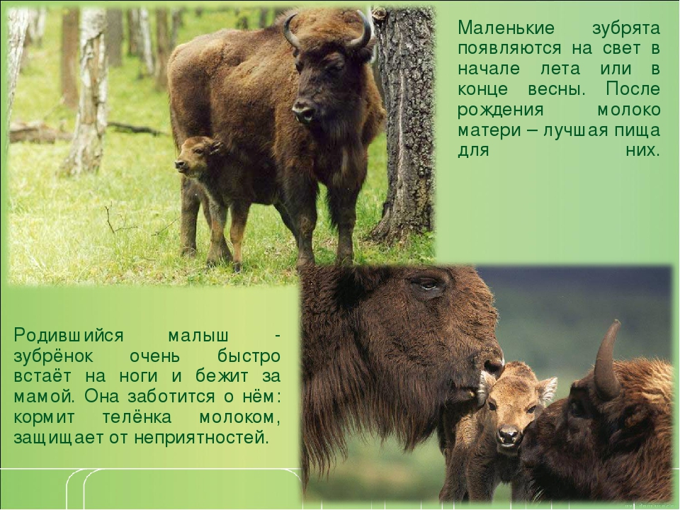 Кстати, самка зубра вынашивает своего детеныша тоже 9 месяцев. Только, в отличие от человеческого малыша, зубренок уже через час встает на ножки и готов бежать за матерью. А через двадцать дней он уже может самостоятельно питаться свежей травой. Хотя кормить малыша молоком самка не прекращает в течение пяти месяцев.