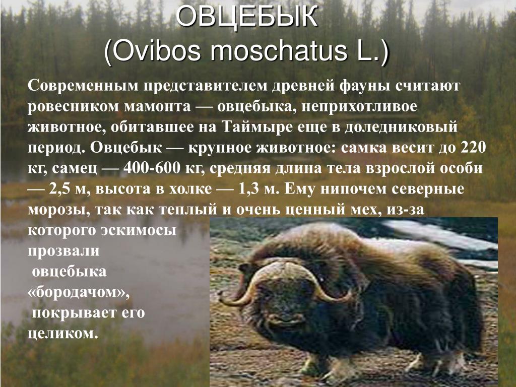Передняя часть тела очень массивная, у самцов высота в холке, образуя большой горб, сильно превышает высоту в крестце. Живот подтянут и слабо развит по сравнению с передней частью. Конечности короткие, толстые, копыта парные, черные. Шея короткая, голова относительно небольшая, с черными серповидными рогами. Уши короткие, глаза большие. Зимняя окраска темно-бурая. Волосы курчавые, густые. На верху шеи и холки волосы образуют своеобразную гриву, в конце морды — бороду, они также сильно удлинены под горлом. Хвост достигает скакательного сустава, заканчивается длинными волосами.