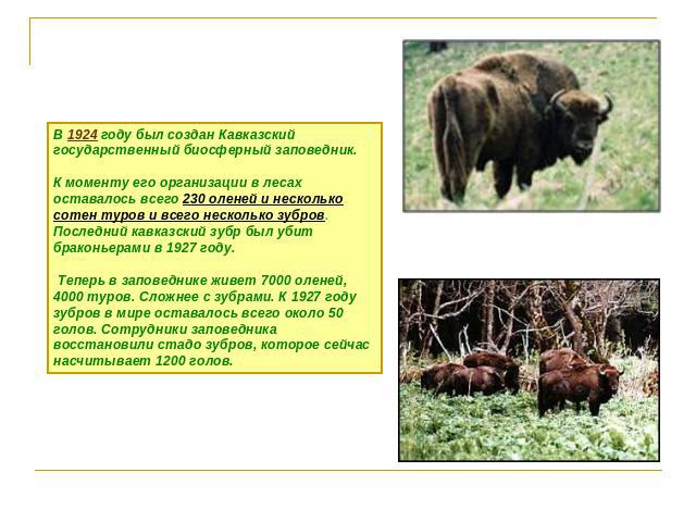 - Высокая научная ценность кавказского зубра была в полной мере оценена как царским, так и позднее советским правительствами: оба собирались создать здесь заповедник. Но практическую охрану этих мест удалось осуществить только к середине 1920-х гг.