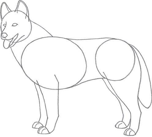 - Следующим шагом станет прорисовка каждой детали созданного контура. Для начала обрисовываются одной линией все созданные формы для объединения их в одну общую фигуру собаки.