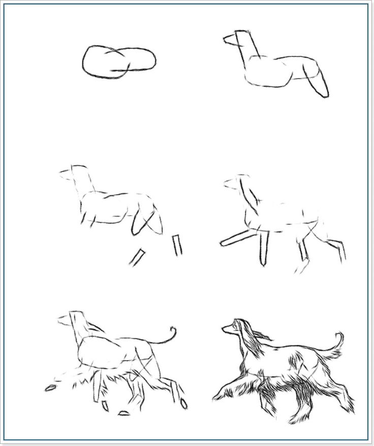 В художественных школах всем приходится учиться создавать такие основы для рисунков. Родители могут сами проводить уроки, поэтапно показывая малышу, как нужно рисовать любимую собаку.