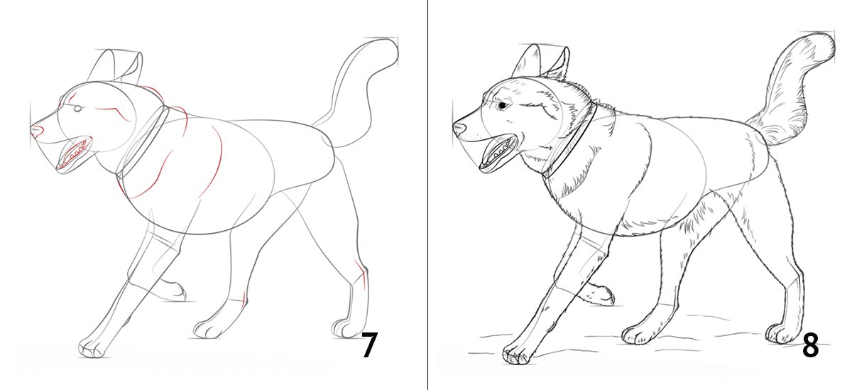 Основные принципы, которые помогают понять, как рисовать собаку, мы освоили. Остались нюансы, которые и сделают нашу картинку похожей на оригинал. А именно, выполняем «пальчики» на лапах, не забываем о хвосте.