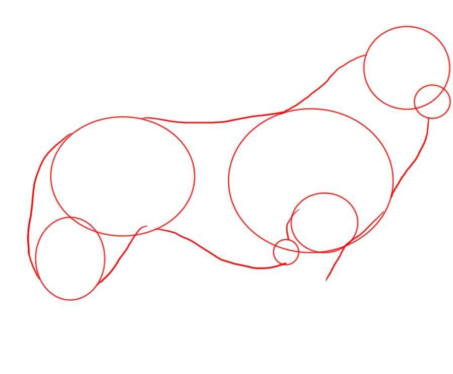 - Для создания контура спины собаки нужно соединить прямой линией самый большой овал с самым маленьким, как показано на фото.