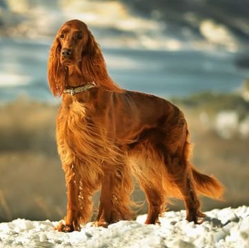 Красный ирландский сеттер на фоне гор и рек в солнечный день. Этот тип сеттеров — выносливая собака, которая будет охотиться в любую погоду.© Ксения Колесникова/Shutterstock.com