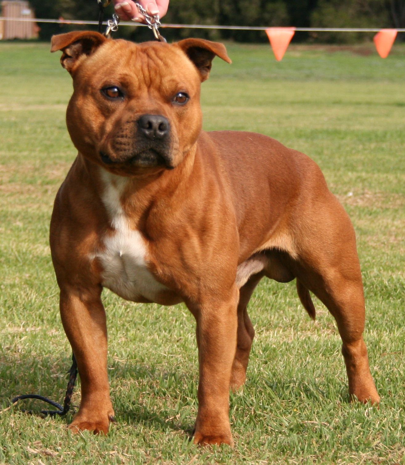 Хорошо воспитанный, социализированный стаффордширский бультерьер прекрасно ладит с людьми и демонстрирует безупречный темперамент и покладистость (иногда может быть несколько шаловливым). С собаками или другими животными стаффордширский бультерьер будет менее дружелюбен, хотя многое зависит от его ранней социализации и дрессировки: есть и те представители породы, которые благополучно сосуществуют с другими собаками и кошками.