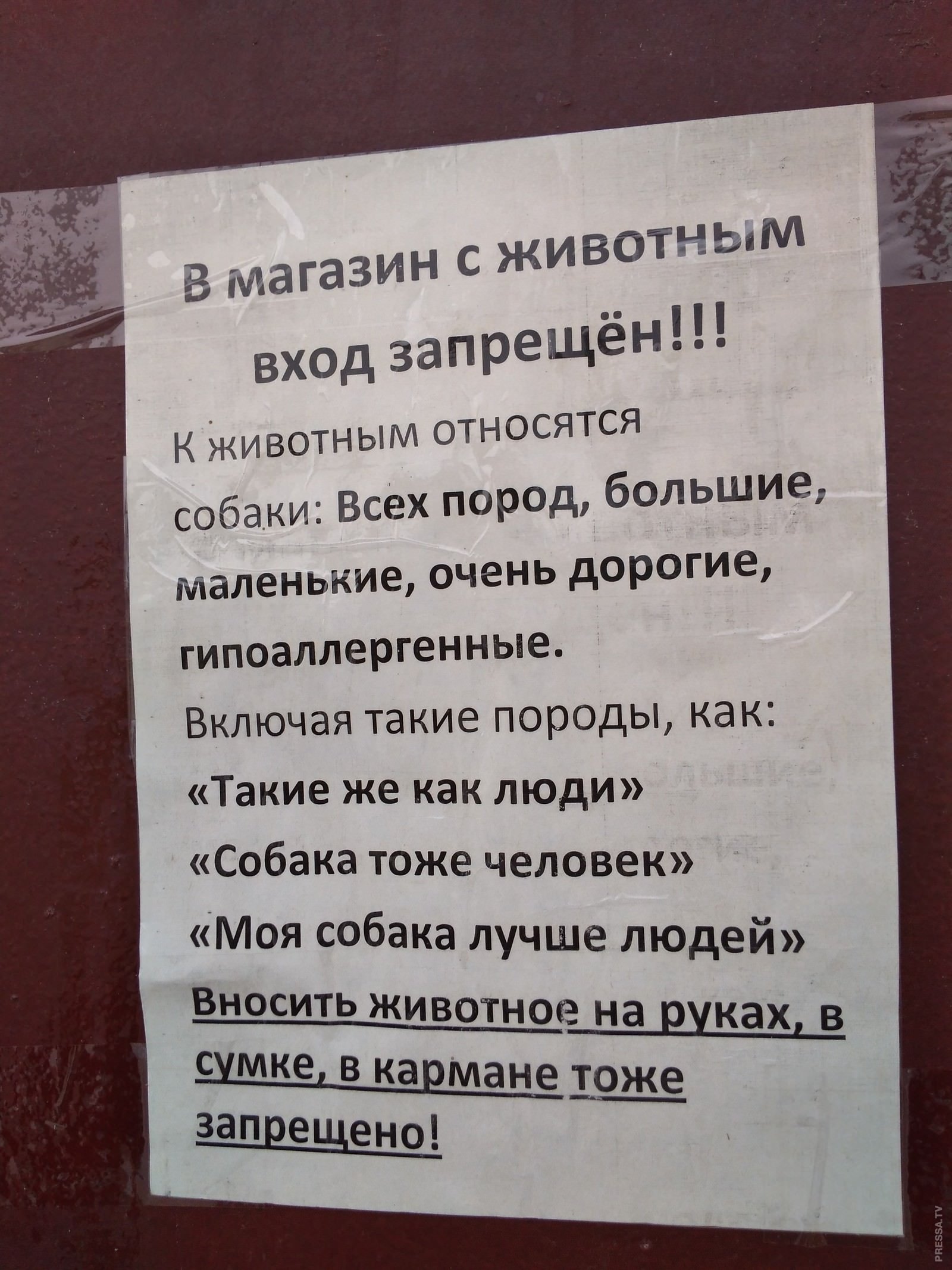 е. если собака на поводке и в наморднике, то можно. А согласно п.3.1 «Любое животное является собственностью владельца и, как всякая собственность, охраняется законом», т.е. животное посетителя — это его собственность как сумка или перчатки, например. Соответственно, мы не запрещаем же человеку входить в аптеку с сумкой или перчатками, поэтому и не можем запретить войти с собакой, если она на поводке и в наморднике.